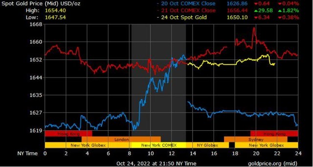 Giá vàng tương lai giao tháng 12/2022 trên sàn Comex New York giảm 2,2 USD xuống mức 1.654,1 USD/ounce.