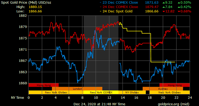 Trên thị trường vàng thế giới, giá vàng giao ngay chốt phiên đêm qua tại Mỹ tăng 7,8 USD lên 1.878,7 USD/ounce. Giá vàng tương lai giao tháng 1/2021 trên sàn Comex New York tăng 6,5 USD lên 1.882,1 USD/ounce.