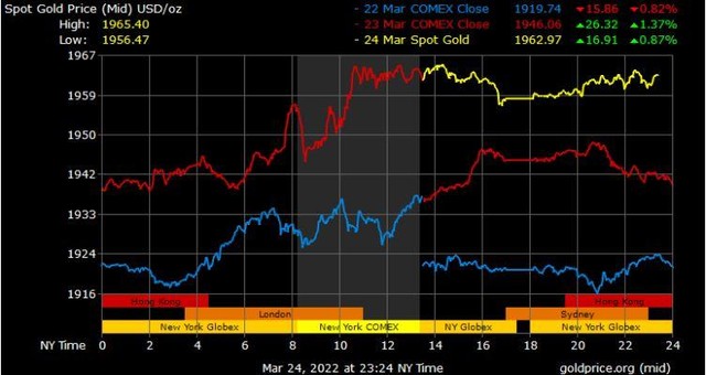 Giá vàng tương lai giao tháng 4/2022 trên sàn Comex New York tăng 24,9 USD lên 1.962,2 USD/ounce.