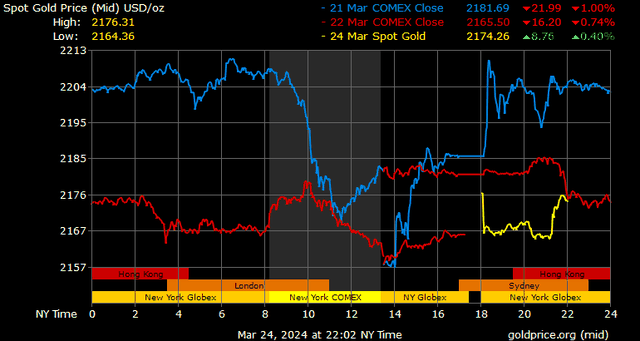 Trên thị trường vàng thế giới, giá vàng giao ngay chốt phiên cuối tuần qua tại Mỹ giảm 16 USD xuống 2.165,3 USD/ounce. Sang phiên châu Á sáng nay, giá vàng đảo chiều tăng 9,5 USD lên 2.174,8 USD/ounce.