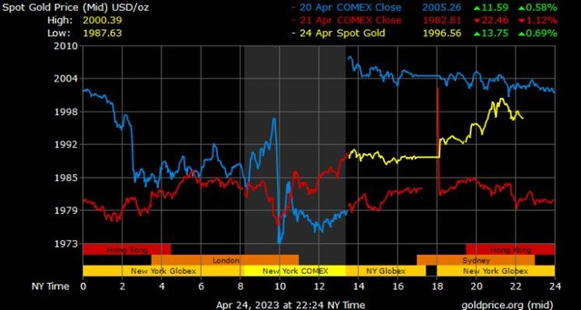 Giá vàng tương lai giao tháng 6/2023 trên sàn Comex New York tăng 9,3 USD, tương ứng tăng 0,47% xuống 1.999,8 USD/ounce.