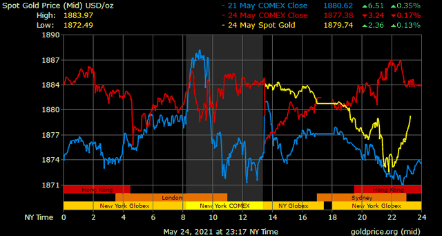 Trên thị trường vàng thế giới, giá vàng giao ngay chốt phiên đêm qua tại Mỹ giảm 0,2 USD lên 1.880,5 USD/ounce. Sang phiên châu Á sáng nay, giá vàng giảm về dưới 1.875 USD/ounce, nhưng cũng đã bật trở lại khá nhanh sau đó lên gần 1.880 USD/ounce.