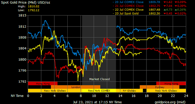 Trên thị trường vàng thế giới, giá vàng giao ngay chốt phiên cuối tuần tại Mỹ giảm 4,7 USD xuống 1.802,2 USD/ounce. Giá vàng tương lai giao tháng 8 trên sàn Comex New York giảm 3,3 USD xuống 1.802,1 USD/ounce.