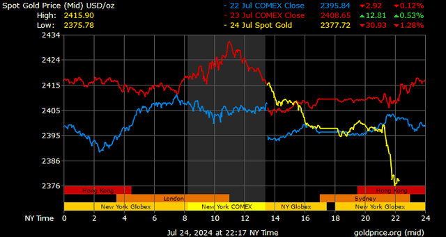 Trên thị trường vàng thế giới, giá vàng giao ngay chốt phiên hôm qua tại Mỹ giảm 12,3 USD xuống 2.397,4 USD/ounce. Sang phiên châu Á sáng nay, giá vàng tiếp tục giảm 20,9 USD xuống 2.376,5 USD/ounce.