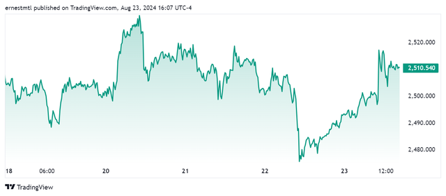 Giá vàng tương lai giao tháng 12/2024 trên sàn Comex New York tăng mạnh 29,6 USD, tương ứng tăng 1,18% lên mức 2.546,3 USD/ounce. Tính chung cả tuần, giá vàng giao ngay tăng 8,5 USD/ounce, tương ứng tăng 0,33%.