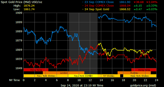 Trên thị trường vàng thế giới, giá vàng giao ngay chốt phiên đêm qua tại Mỹ tăng 5,6 USD lên 1.868,6 USD/ounce. Sang phiên châu Á sáng nay, giá vàng nhích nhẹ lên gần 1.869 USD/ounce. Giá vàng tương lai giao tháng 10 trên sàn Comex New York giảm 6 USD xuống 1.862,9 USD/ounce.