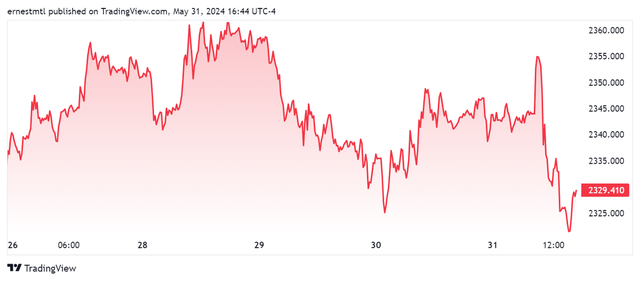 Giá vàng tương lai giao tháng 6/2024 trên sàn Comex New York giảm 20,7 USD, tương ứng giảm 0,87% xuống mức 2.345,8 USD/ounce. Tính chung cả tuần, giá vàng giao ngay giảm 11,1 USD/ounce, tương ứng giảm 0,47%.