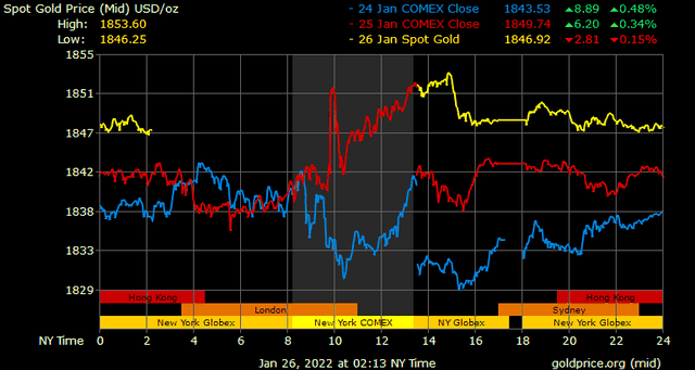 Giá vàng tương lai giao tháng 2/2022 trên sàn Comex New York giảm 6 USD xuống 1.846,5 USD/ounce.