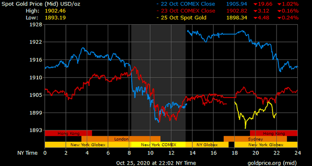 Trên thị trường vàng thế giới, giá vàng giao ngay chốt phiên cuối tuần qua tại Mỹ giảm 3,8 USD xuống 1.901,3 USD/ounce. Sang phiên châu Á sáng nay, giá vàng đột ngột lao dốc mạnh xuống gần 1.890 USD/ounce, nhưng sau đó cũng đã nhanh chóng bật trở lại gần ngưỡng 1.900 USD/ounce.
