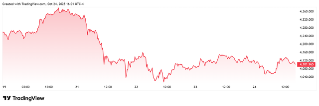 Giá vàng tương lai giao tháng 12/2025 trên sàn Comex New York Giá được giao dịch lần cuối ở mức 4.112,20 USD/ounce, giảm 0,32% trong ngày và thấp hơn 3% so với thứ Sáu tuần trước.