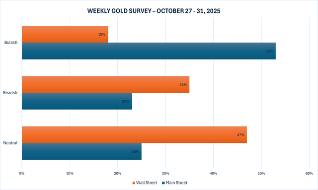 Cuộc khảo sát vàng hàng tuần mới nhất của Kitco News cho thấy phần lớn Phố Wall chuyển sang xu hướng giảm giá hoặc trung lập, trong khi các nhà đầu tư Main Street vẫn bám vào xu hướng tăng giá.