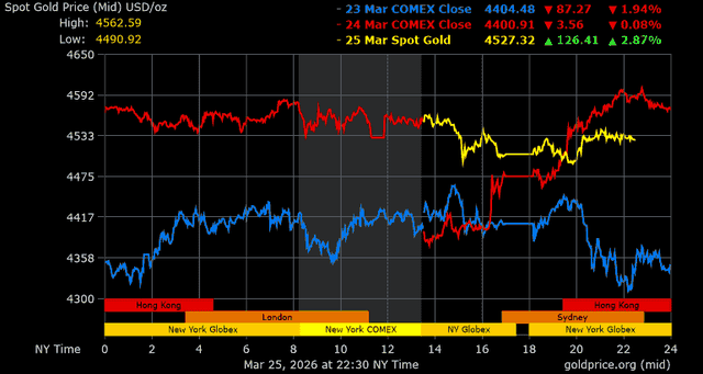 Trên thị trường vàng thế giới, giá vàng giao ngay chốt phiên hôm qua tại Mỹ tăng 32,6 USD, tương ứng tăng 0,73% lên mức 4.506,8 USD/ounce. Sang phiên châu Á sáng nay, giá vàng tiếp tục tăng 23,3 USD lên mức 4.530,2 USD/ounce.