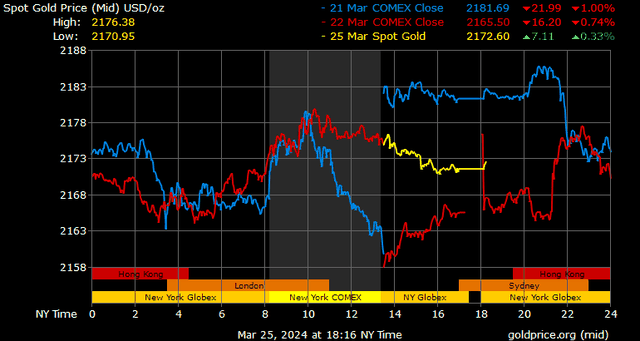 Trên thị trường vàng thế giới, giá vàng giao ngay chốt phiên hôm qua tại Mỹ tăng 6,5 USD lên 2.171,8 USD/ounce. Sang phiên châu Á sáng nay, giá vàng đảo chiều giảm nhẹ 1 USD xuống 2.170,8 USD/ounce.