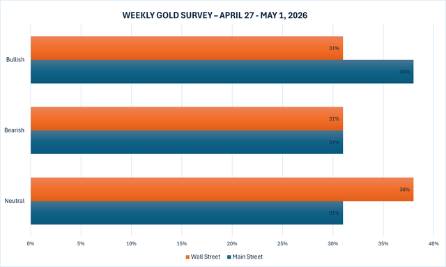 Khảo sát vàng hàng tuần mới nhất của Kitco News cho thấy Phố Wall và Phố Chính có quan điểm trái chiều và không chắc chắn về hướng đi ngắn hạn của vàng sau một tuần suy yếu của kim loại quý này.