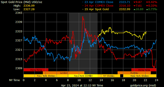 Giá vàng tương lai giao tháng 6/2024 trên sàn Comex New York tăng 4,1 USD, tương ứng tăng 0,18% lên mức 2.342,5 USD/ounce.
