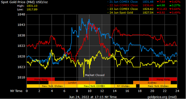 Tính chung cả tuần, giá vàng giao ngay giảm 10,3 USD/ounce, tương ứng giảm 0,56%, đánh dấu tuần giảm thứ 2 liên tiếp, trong bối cảnh giới đầu tư đang lo ngại rằng sự thắt chặt chính sách tiền tệ mạnh mẽ của Cục Dự trữ Liên bang Mỹ (Fed) sẽ kìm hãm nền kinh tế.