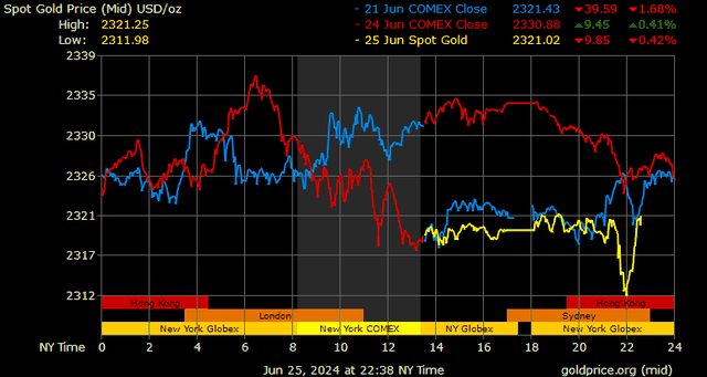 Giá vàng tương lai giao tháng 8/2024 trên sàn Comex New York giảm 13,6 USD, tương ứng giảm 0,58% xuống mức 2.330,8 USD/ounce.