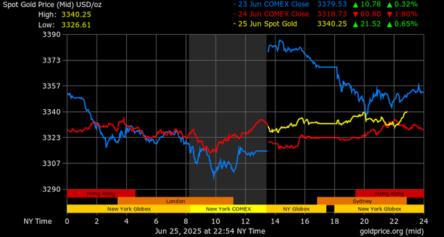 Giá vàng tương lai giao tháng 8/2025 trên sàn Comex New York tăng 9,2 USD, tương ứng tăng 0,28% lên mức 3.343,1 USD/ounce.