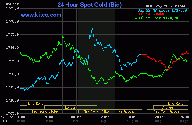 Trên thị trường vàng thế giới, giá vàng giao ngay chốt phiên đêm qua tại Mỹ giảm 7,3 USD xuống 1.720 USD/ounce. Sang phiên châu Á sáng nay, giá vàng nhích nhẹ lên gần 1.725 USD/ounce. Giá vàng tương lai giao tháng 8/2022 trên sàn Comex New York tăng gần 5 USD lên 1.723,7 USD/ounce.