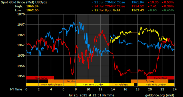 Giá vàng tương lai giao tháng 8/2023 trên sàn Comex New York tăng nhẹ 1,5 USD, tương ứng tăng 0,01% lên 1.963,7 USD/ounce.