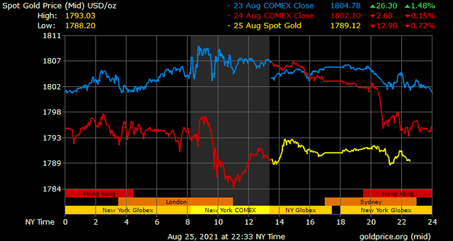 Giá vàng thế giới phiên ngày thứ Tư nối tiếp đà giảm và nhanh chóng để mất mốc tâm lý 1.800 USD/ounce, khi sự thận trọng gia tăng khiến áp lực bán thắng thế, ngay trước thềm hội nghị Jackson Hole thường niên của Fed. Ngoài ra, lợi suất trái phiếu Mỹ và phố Wall tăng điểm cũng tác động xấu đến vàng.