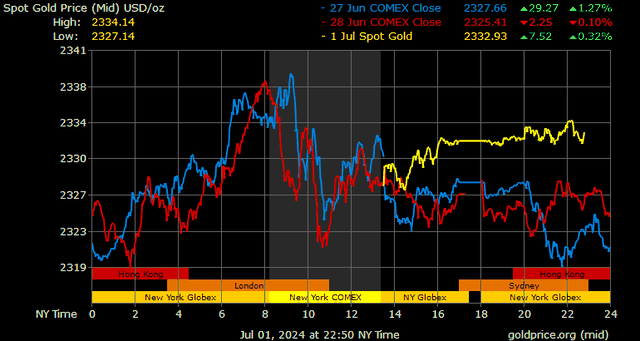 Giá vàng tương lai giao tháng 8/2024 trên sàn Comex New York giảm nhẹ 0,7 USD, tương ứng giảm 0,03% xuống mức 2.338,9 USD/ounce.