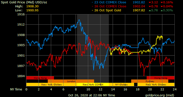 Trên thị trường vàng thế giới, giá vàng giao ngay chốt phiên đêm qua tại Mỹ tăng 1 USD xuống 1.902,3 USD/ounce. Sang phiên châu Á sáng nay, giá vàng nhích lên trên 1.907 USD/ounce. Giá vàng tương lai giao tháng 11 trên sàn Comex New York tăng 3,9 USD lên 1.907 USD/ounce.