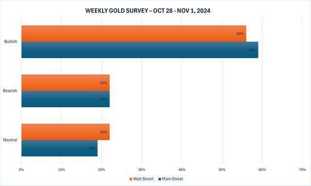 Trong khi đó, 213 phiếu bầu đã được bỏ trong cuộc thăm dò trực tuyến của Kitco, với phần lớn các nhà đầu tư Main Street có xu hướng tăng giá. 126 nhà giao dịch bán lẻ, hay 59%, kỳ vọng giá vàng sẽ tăng vào tuần tới, trong khi 47 người, hay 22%, kỳ vọng kim loại màu vàng sẽ giao dịch thấp hơn. 40 nhà đầu tư còn lại, chiếm 19% tổng số, kỳ vọng giá sẽ có xu hướng đi ngang trong tuần tới.