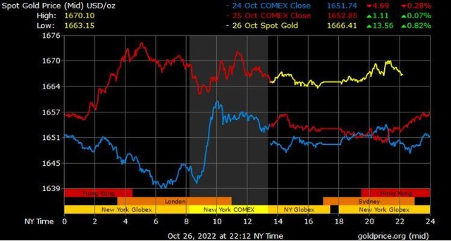 Giá vàng tương lai giao tháng 12/2022 trên sàn Comex New York tăng 11,2 USD lên mức 1.669,2 USD/ounce.