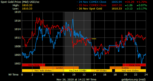 Trên thị trường vàng thế giới, giá vàng giao ngay chốt phiên đêm tại Mỹ tăng 2 USD lên 1.810,1 USD/ounce. Sang phiên châu Á sáng nay, giá vàng giảm nhẹ xuống . Giá vàng tương lai giao tháng 12 trên sàn Comex New York tăng 1,6 USD lên 1.807,1 USD/ounce.