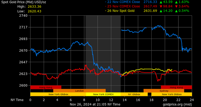 Giá vàng tương lai giao tháng 12/2024 trên sàn Comex New York tăng nhẹ 2,8 USD, tương ứng tăng 0,11% lên mức 2.621,3 USD/ounce.