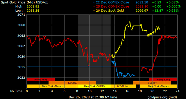 Giá vàng tương lai giao tháng 2/2024 trên sàn Comex New York tăng nhẹ 0,7 USD, tương ứng tăng 0,03% lên 2.069,8 USD/ounce.