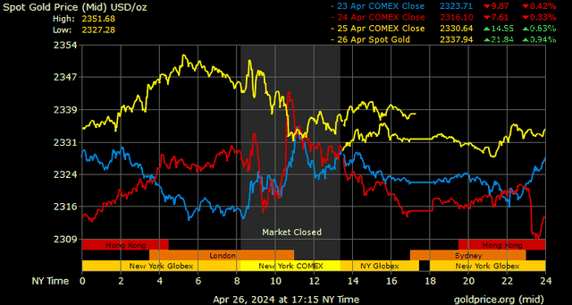 Trên thị trường vàng thế giới, giá vàng giao ngay chốt phiên hôm qua tại Mỹ tăng 5,7 USD lên 2.337,4 USD/ounce.