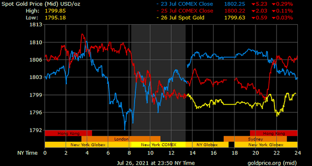 Trên thị trường vàng thế giới, giá vàng giao ngay chốt phiên đêm qua tại Mỹ giảm 4,7 USD xuống 1.797,5 USD/ounce. Sang phiên châu Á sáng nay, giá vàng hồi phục và áp sát 1.800 USD/ounce.