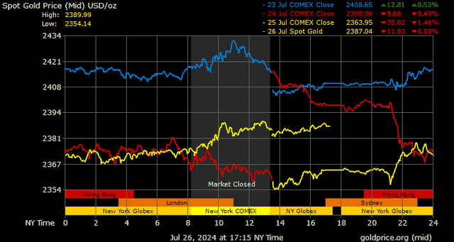 Giá vàng tương lai giao tháng 8/2024 trên sàn Comex New York tăng 27,5 USD, tương ứng tăng 1,17% lên mức 2.381 USD/ounce.
