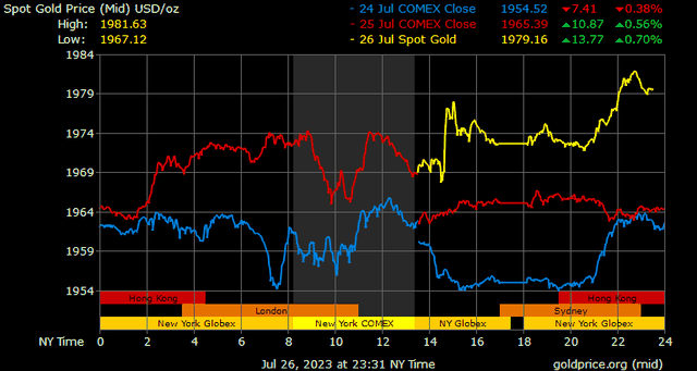 Giá vàng tương lai giao tháng 8/2023 trên sàn Comex New York tăng 6,4 USD, tương ứng tăng 0,33% lên 1.970,1 USD/ounce.