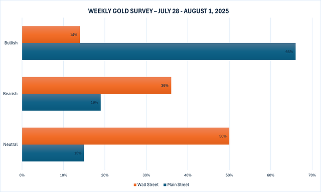 Tuần này, 14 nhà phân tích đã tham gia Khảo sát Vàng của Kitco News, với số lượng nhà đầu cơ giá lên trên Phố Wall đang khan hiếm sau cú bứt phá thất bại của vàng. Chỉ có hai chuyên gia, tương đương 14%, vẫn kỳ vọng giá vàng sẽ tăng trong tuần tới, trong khi năm chuyên gia khác, chiếm 36%, dự đoán giá sẽ giảm. Bảy nhà phân tích còn lại, tương đương 50%, dự đoán giá kim loại quý này sẽ dao động trong biên độ đi ngang vào tuần tới.