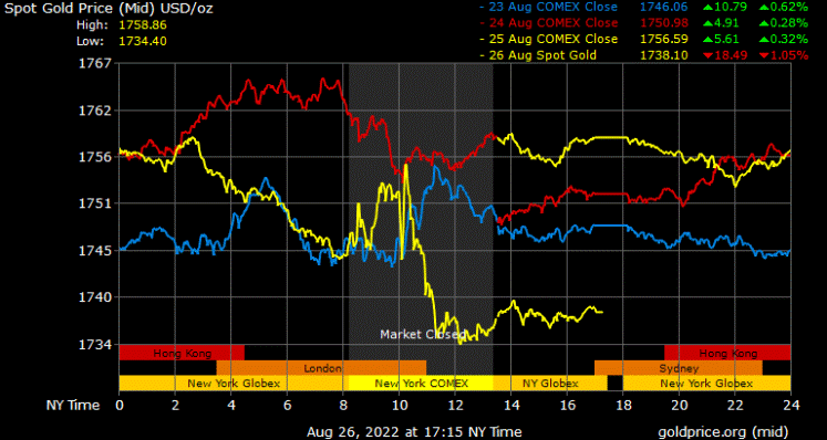 Giá vàng đã giảm xuống mức thấp nhất trong phiên khi Chủ tịch Cục Dự trữ Liên bang Jerome Powell thể hiện một giọng điệu diều hâu dự kiến trong bài phát biểu được nhiều người mong đợi của ông tại Jackson Hole, Wyoming.
