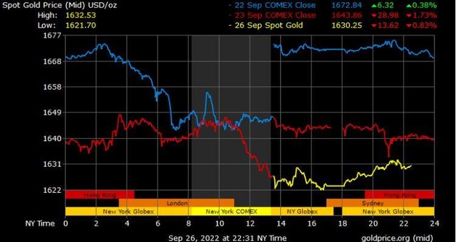 Giá vàng tương lai giao tháng 10/2022 trên sàn Comex New York giảm 21,7 USD xuống 1.623,6 USD/ounce.