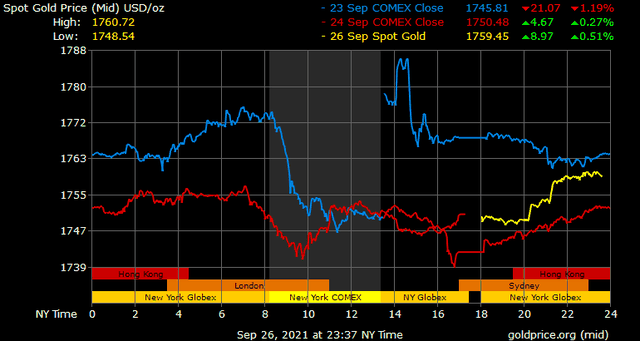 Trên thị trường vàng thế giới, giá vàng giao ngay chốt phiên cuối tuần qua tại Mỹ tăng 7,4 USD lên 1.750,2 USD/ounce. Sang phiên châu Á sáng nay, giá vàng nhích lên ngưỡng 1.760 USD/ounce.