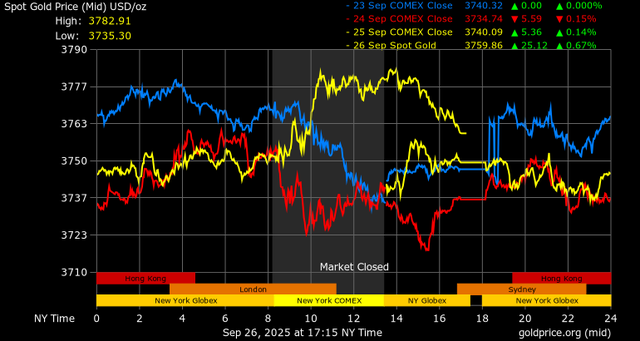 Trên thị trường vàng thế giới, giá vàng giao ngay chốt phiên hôm qua tại Mỹ tăng 10,4 USD lên 3.759,9 USD/ounce.