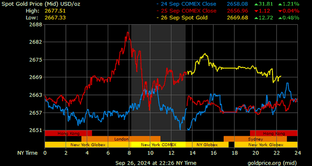 Vàng đã có thời điểm đạt kỷ lục mới khi vượt mốc 2.700 USD/ounce trước khi hạ độ cao khi Trung Quốc có thêm nhiều biện pháp kích thích nền kinh tế và nhu cầu trú ấn an toàn đang hỗ trợ cho nhu cầu mua vào kim loại quý.