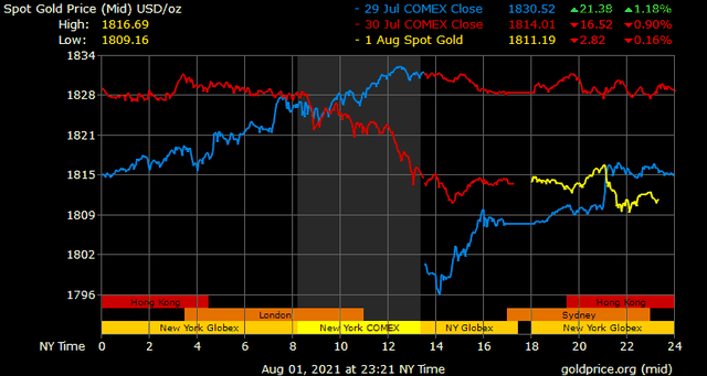 Giá vàng tương lai giao tháng 9 trên sàn Comex New York giảm 3,6 USD xuống 1.809,9 USD/ounce.