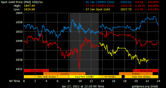 Trên thị trường vàng thế giới, giá vàng giao ngay chốt phiên đêm qua tại Mỹ giảm 6 USD xuống 1.844,6 USD/ounce. Sang phiên châu Á sáng nay, giá vàng giảm tiếp xuống gần 1.837 USD/ounce.