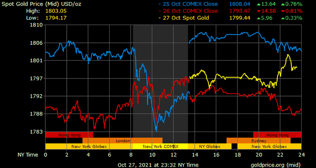 Trên thị trường vàng thế giới, giá vàng giao ngay chốt phiên đêm qua tại Mỹ tăng 3,8 USD lên 1.797 USD/ounce. Sang phiên châu Á sáng nay, giá vàng bật trở lại lên trên mốc 1.800 USD/ounce.