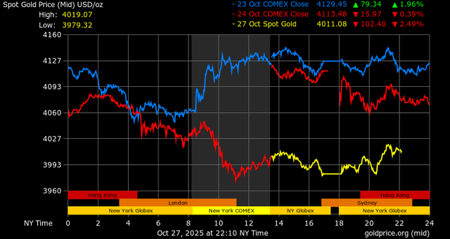 Giá vàng tương lai giao tháng 12/2025 trên sàn Comex New York giảm 118,1 USD, tương ứng giảm 2,85% xuống mức 4.019,7 USD/ounce.