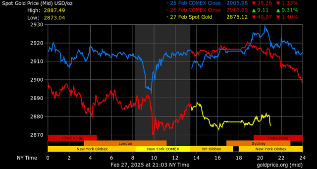 Giá vàng tương lai giao tháng 4/2025 trên sàn Comex New York giảm 34,7 USD, tương ứng giảm 1,18% xuống mức 2.895,9 USD/ounce.