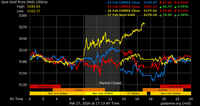Trên thị trường vàng thế giới, giá vàng giao ngay chốt phiên hôm qua tại Mỹ tăng 93,3 USD, tương ứng tăng 1,8% lên mức 5.278,5 USD/ounce.