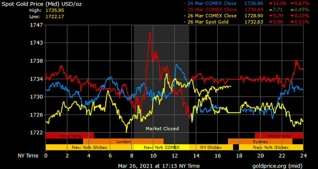 Trên thị trường vàng thế giới, giá vàng giao ngay chốt phiên cuối tuần tại Mỹ tăng 6,6 USD lên 1.733,3 USD/ounce. Giá vàng tương lai giao tháng 4 trên sàn Comex New York tăng 6,5 USD lên 1.731,6 USD/ounce.
