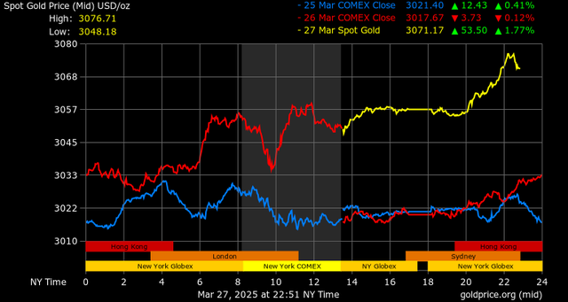 Trên thị trường vàng thế giới, giá vàng giao ngay chốt phiên hôm qua tại Mỹ tăng mạnh 37,1 USD lên mức 3.056,6 USD/ounce. Sang phiên châu Á sáng nay, giá vàng tiếp tục tăng 15,1 USD lên 3.071,7 USD/ounce.
